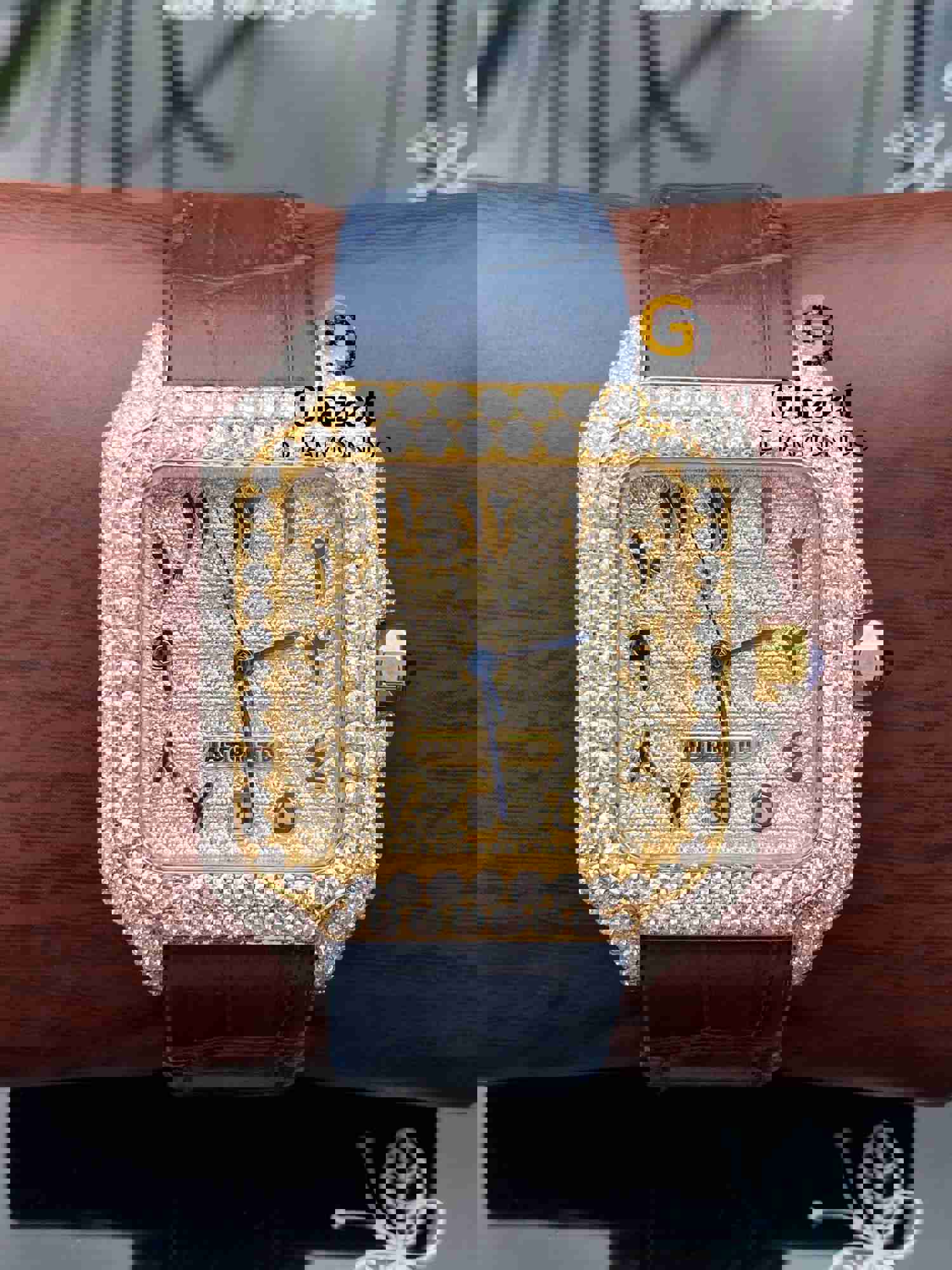 Royal Blue Leather Strap Two Tone Iced Moissanite Studded Watch